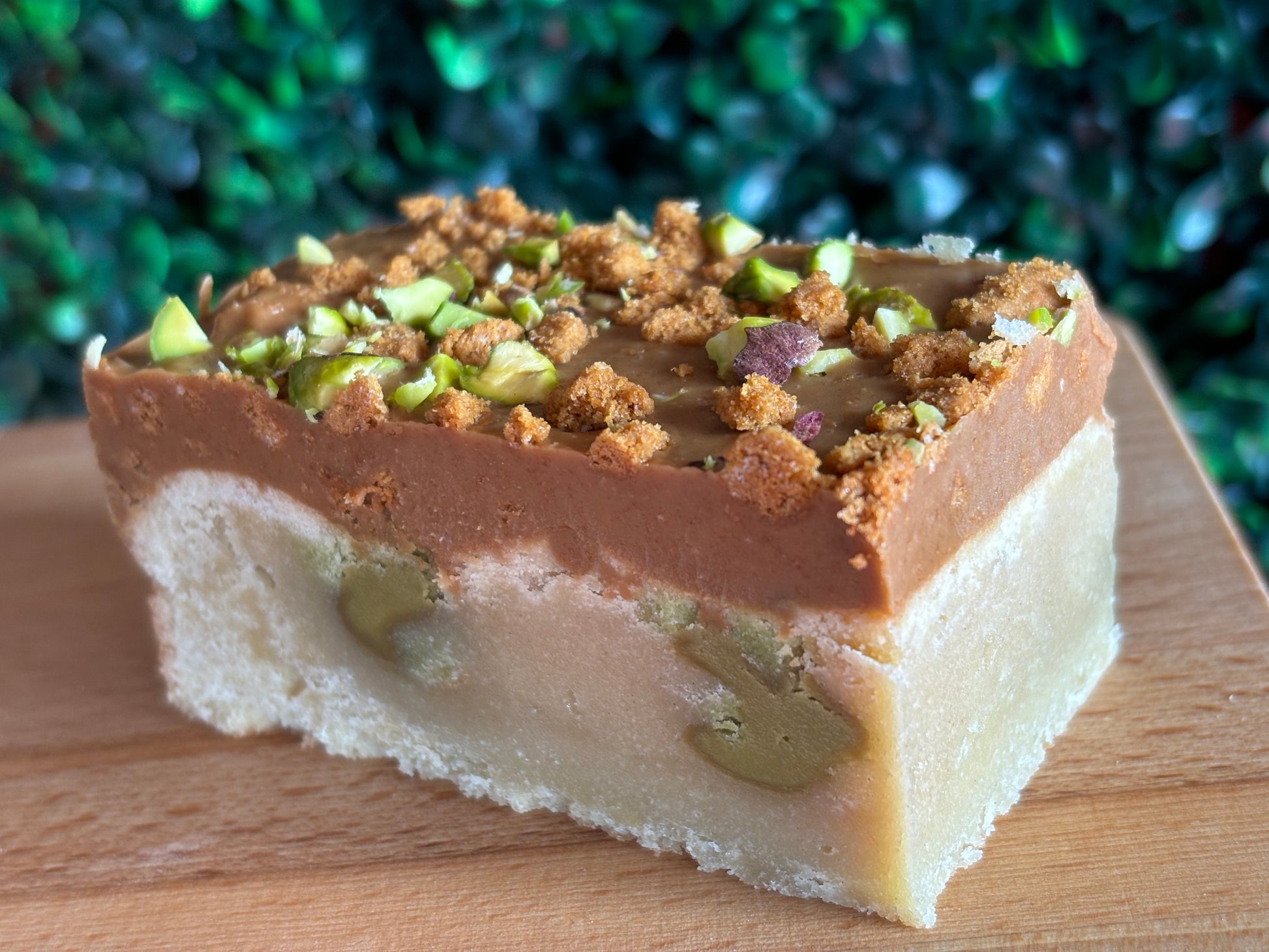 A fantastic flavour combination!! Our signature blondie filled with pistachio cream and topped with crunchy speculoos spread & Lotus Biscoff crumb! To finish, chopped pieces of pistachios & Lotus crumb are sprinkled over the top!