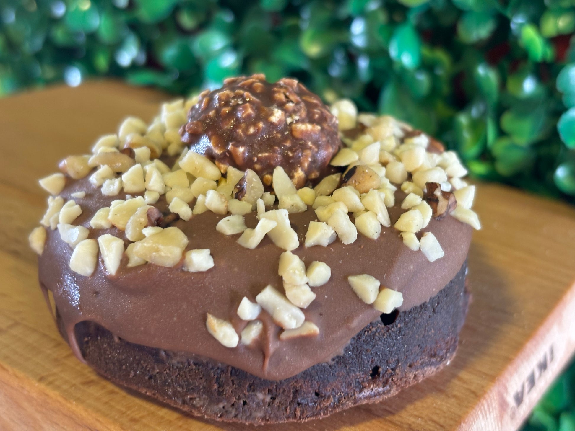 Our signature chocolate chip brownie in the shape of a do-nut, dipped into thick milk chocolate, sprinkled with chopped nuts and finished with a Fererro Roche.